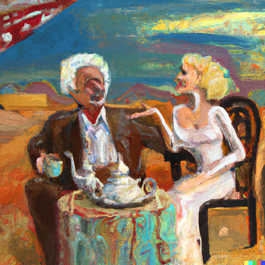 "Albert Einstein and Marilyn Monroe having tea in the desert, impressionism."
